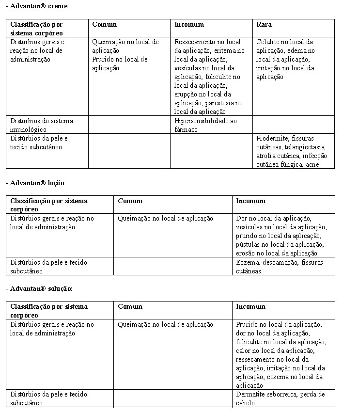 Em estudos clínicos, as reações adversas observadas mais frequentemente incluem queimação no local da aplicação para Advantan® creme, loção e solução e também prurido no local da aplicação para Advantan® creme.