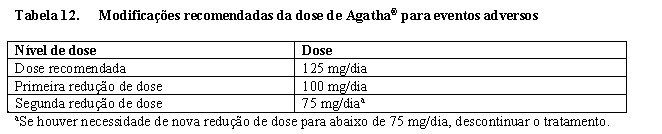 Deve-se monitorar o hemograma antes do início da terapia com Agatha® e no início de cada ciclo, bem como no dia 15 dos dois primeiros ciclos e conforme indicação clínica.