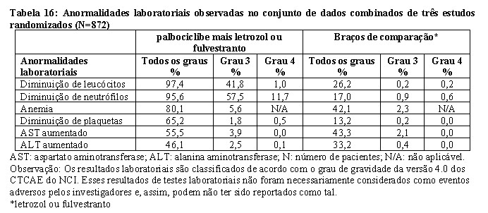 Observou-se contagens de neutrófilos reduzidas em estudos clínicos com palbociclibe. Em pacientes recebendo palbociclibe em combinação com letrozol (Estudo 1 e 2) ou fulvestranto (Estudo 3), uma redução na contagem de neutrófilos de Grau 3 e Grau 4 foi relatada em 56,1% e 10,6% das pacientes, respectivamente.