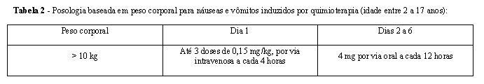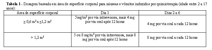 A dose em casos de náuseas e vômitos induzidos por quimioterapia pode ser calculada baseada na área de superfície corporal ou peso. Em estudos clínicos pediátricos, ondansetrona foi administrada através de infusão intravenosa diluída em 25 a 50 mL de solução salina ou outro fluido de infusão compatível e infundida por um período superior a 15 minutos.