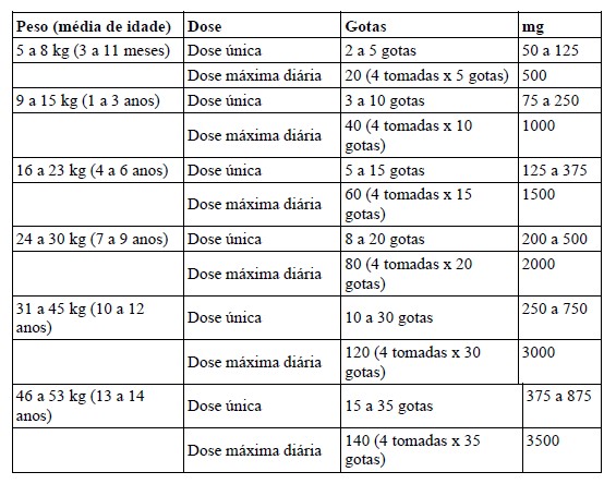 Solução oral (Gotas) 500 mg/mL: frascos plásticos opacos conta-gotas com 20 mL.