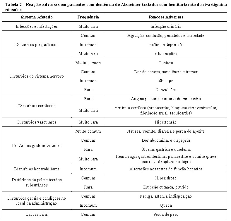 As seguintes reações adversas foram identificadas com hemitartarato de rivastigmina cápsulas baseadas em relatos espontâneos na pós-comercialização. Como estas reações são relatadas voluntariamente por uma população de tamanho incerto, nem sempre é possível estimar com segurança a sua frequência ou estabelecer a relação causal relacionada à exposição do medicamento.