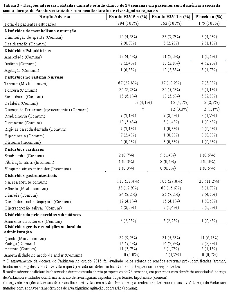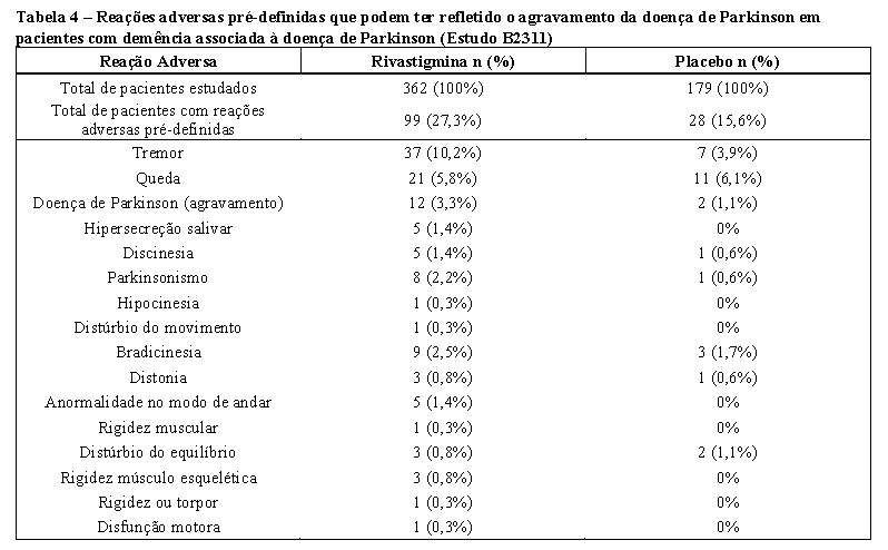 A Tabela 4 relaciona o número e a porcentagem de pacientes do estudo clínico de 24 semanas de duração conduzidos com hemitartarato de rivastigmina em pacientes com demência associada à doença de Parkinson com reações pré-definidas que podem ter refletido o agravamento da doença de Parkinson.