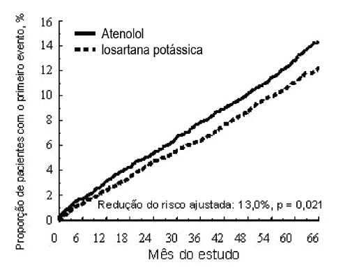 O desfecho primário foi o composto de morbidade e mortalidade cardiovasculares, avaliado pela redução da incidência combinada de morte cardiovascular, acidente vascular cerebral e infarto do miocárdio. Os resultados mostraram que o tratamento com losartana potássica, em comparação ao com atenolol, resultou em 13,0% de redução do risco (p=0,021) para os pacientes que atingiram o desfecho primário composto (veja a figura 1).