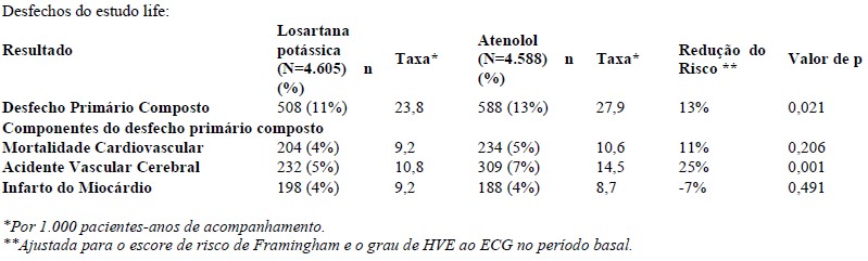 Estudo LIFE (Losartan Intervention For Endpoint reduction in hypertension): foi um estudo de grande porte, multicêntrico, multinacional, randômico, triplo-cego, controlado com medicação ativa que envolveu 9.193 pacientes hipertensos com idades entre 55 e 80 anos (média de 67 anos) e hipertrofia ventricular esquerda documentada por ECG. No período basal, 1.195 (13%) pacientes apresentavam diabetes; 1.326 (14%), hipertensão sistólica isolada; 1.468 (17%), doença coronariana e 728 (8%), doença vascular cerebral. O objetivo do estudo foi demonstrar os efeitos protetores cardiovasculares de losartana potássica versus atenolol, além dos benefícios do controle da pressão arterial (medida no vale). Para atingir esse objetivo, a meta da pressão arterial foi a mesma para os dois grupos de tratamento. Os pacientes foram distribuídos de modo randômico para receber 50 mg de losartana potássica ou 50 mg de atenolol, uma vez ao dia. Quando a meta da pressão arterial ( < 140/90 mmHg) não era atingida, adicionava-se, em primeiro lugar, a hidroclorotiazida (12,5 mg) e, se necessário, aumentava-se a dose de losartana potássica ou de atenolol para 100 mg uma vez ao dia. Se para atingir a meta ainda houvesse a necessidade de outras modificações do esquema terapêutico (por exemplo, aumento da dose de hidroclorotiazida para 25 mg ou adição de outro tratamento diurético ou de bloqueadores dos canais de cálcio, alfabloqueadores ou agentes de ação central), estas eram feitas. A adição de inibidores da ECA, antagonistas da angiotensina II ou betabloqueadores não foi permitida.