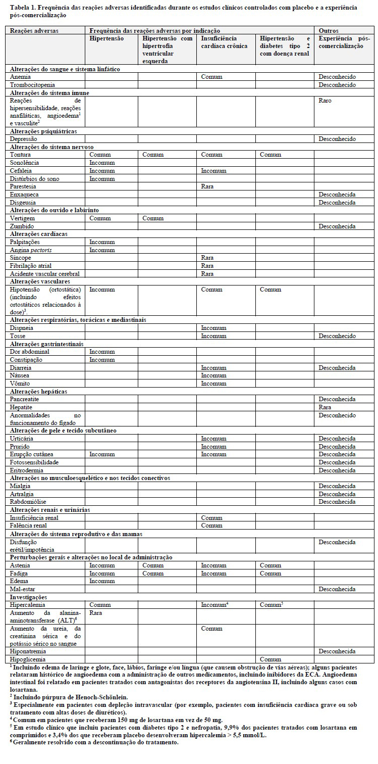 Outras advertências e precauções: assim como observado com os inibidores da enzima conversora da angiotensina, a losartana e outros antagonistas da angiotensina são aparentemente menos efetivos na redução da pressão sanguínea em pacientes negros, possivelmente devido a uma maior prevalência de baixo nível de renina nessa população.