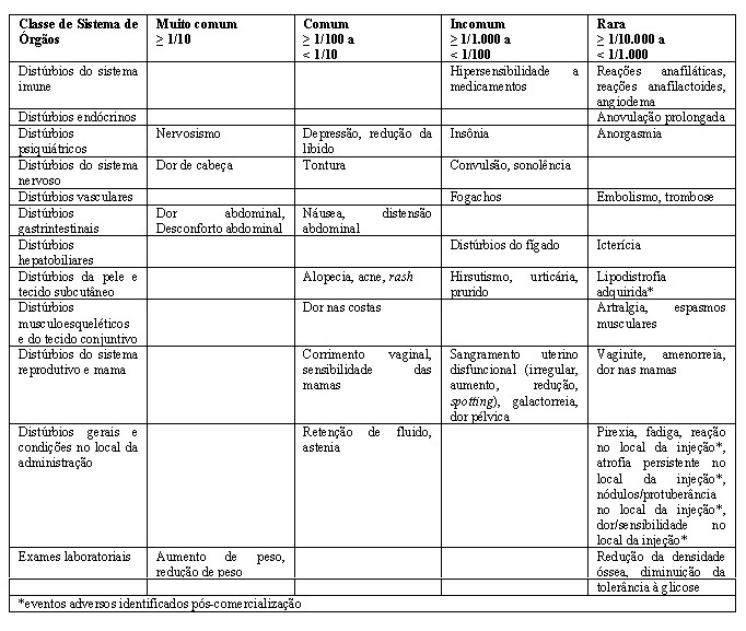 Reações adversas por Classe de Sistema de Órgãos (SOC) e categoria de frequência CIOMS (Council for International Organizations of Medical Sciences) listada por ordem decrescente de gravidade médica dentro de cada categoria de frequência e SOC. A tabela abaixo fornece a lista de reações adversas com frequência baseada em dados de todas as casualidades de estudos clínicos que incluíram mais de 4.200 mulheres que receberam DMPA para contracepção por até 7 anos. As reações adversas mais frequentemente reportadas ( > 5%) foram aumento de peso (69%), redução de peso (25%), dor de cabeça (16%), nervosismo (11%), dor ou desconforto abdominal (11%), tontura (6%) e redução na libido (6%).
