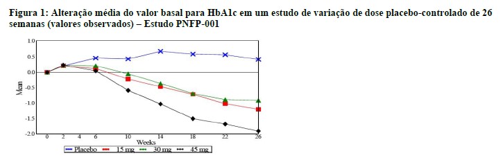 Em um estudo de monoterapia com variação de dose, de 26 semanas, 408 pacientes com diabetes tipo II foram randomizados para receber 7,5 mg, 15 mg, 30 mg ou 45 mg de pioglitazona ou placebo uma vez ao dia. A terapia com qualquer agente antidiabético anterior foi interrompida 8 semanas antes do período duplo-cego. O tratamento com 15 mg, 30 mg e 45 mg de pioglitazona produziu melhorias estatisticamente significativas na HbA1c e na glicemia em jejum no desfecho "endpoint" em comparação com placebo (ver Figura 1, Tabela 1).