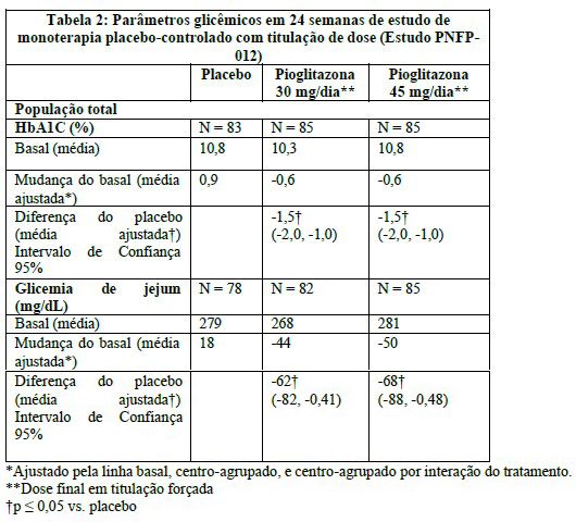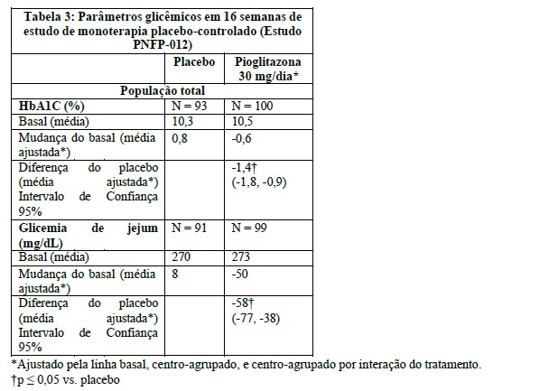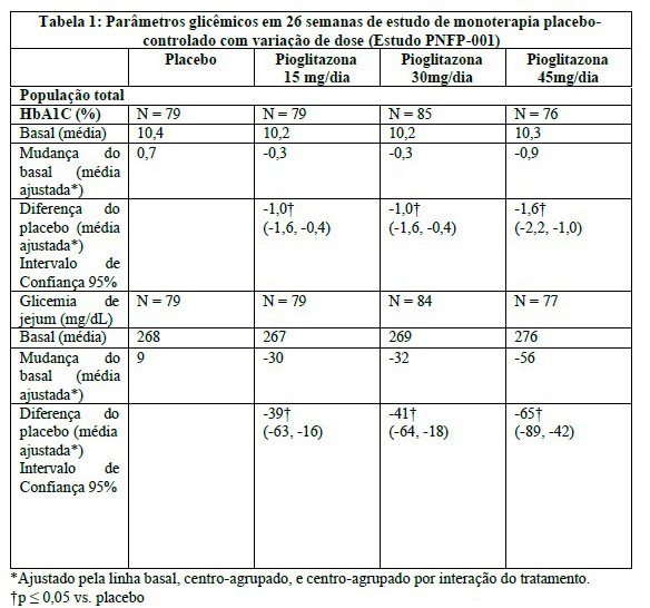 Num estudo de monoterapia de 16 semanas, 197 pacientes com diabetes tipo II foram randomizados para o tratamento com 30 mg de pioglitazona ou placebo uma vez ao dia. O tratamento com qualquer agente antidiabético anterior foi interrompido 6 semanas antes do período do duplo-cego. O tratamento com 30 mg de pioglitazona produziu melhorias estatisticamente significativas na HbA1c e FPG no desfecho "endpoint", em comparação com placebo (Tabela 3).