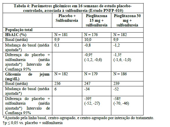 No primeiro estudo, 560 pacientes foram distribuídos aleatoriamente para receber 15 mg ou 30 mg de pioglitazona ou placebo, uma vez ao dia, durante 16 semanas, em adição ao seu regime atual de sulfonilureia. O tratamento com pioglitazona em associação à sulfonilureia produziu melhoras estatisticamente significativas na HbA1c e FPG no desfecho "endpoint"em comparação com placebo em associação a sulfoniluréias (Tabela 4).