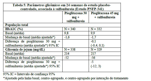 No segundo estudo, 702 pacientes foram randomizados para receber 30 mg ou 45 mg de pioglitazona uma vez por dia, durante 24 semanas, além de seu regime vigente de sulfonilureia. A redução média de HbA1c em relação ao valor basal na 24ª semana foi de 1,6% para a dose de 30 mg e 1,7% para a dose de 45 mg (ver Tabela 5). A redução média de FPG em relação ao valor basal na 24ª semana foi de 52 mg/dL para o 30 mg de dose e 56 mg/dL para a dose de 45 mg.