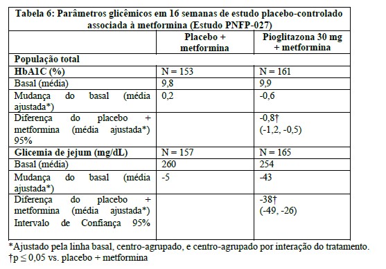 No primeiro estudo, 328 pacientes foram randomizados para receber 30 mg de pioglitazona ou placebo uma vez ao dia, durante 16 semanas, além do regime de metformina. O tratamento com pioglitazona em associação à metformina produziu melhoras estatisticamente significativas na HbA1c e FPG no desfecho "endpoint" em comparação ao tratamento com placebo associado à metformina (ver Tabela 6).