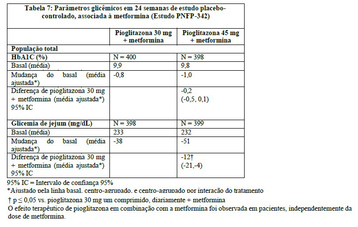No segundo estudo, 827 pacientes foram randomizados para receber 30 mg ou 45 mg de pioglitazona uma vez por dia, durante 24 semanas, além do regime de metformina. A redução média de HbA1c em relação ao valor basal na 24ª semana foi de 0,8% para a dose de 30 mg e 1,0% para a dose de 45 mg (ver Tabela 7). A redução média de FPG em relação ao valor basal na 24ª semana foi de 38 mg/dL para a dose de 30 mg e 51 mg/dL para a dose de 45 mg.