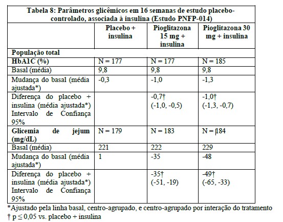 Em um estudo controlado por placebo, os pacientes com controle glicêmico inadequado, apesar de um período de três meses para otimização de insulina, foram randomizados para pioglitazona ou placebo durante 12 meses. Os pacientes que receberam pioglitazona tiveram uma redução média na HbA1c de 0,45% em comparação com os que continuaram a tomar somente insulina e uma redução da dose de insulina no grupo tratado com pioglitazona.
