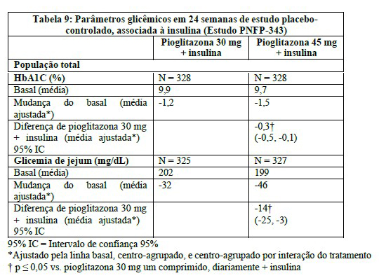 No segundo estudo, 690 pacientes que recebem uma média de 60 unidades de insulina por dia foram randomizados para receber 30 mg ou 45 mg de pioglitazona uma vez por dia, durante 24 semanas, além do regime atual de insulina. A redução média de HbA1c em relação ao valor basal na 24ª semana foi de 1,2% para a dose de 30 mg e 1,5% para a dose de 45 mg. A redução média de FPG em relação ao valor basal na 24ª semana foi de 32 mg / dL para a dose de 30 mg e de 46 mg / dL para a dose de 45 mg (ver Tabela 9). A maioria dos pacientes (55% do total, 58% tratados com pioglitazona 30 mg, e 52% tratados com pioglitazona 45 mg) não teve alteração em sua dose diária de insulina a partir do valor basal até a última visita do estudo. A alteração média do valor basal na dose diária de insulina (incluindo pacientes sem modificações da dose de insulina) foi de -5 unidades nos pacientes tratados com pioglitazona 30 mg e -8 unidades nos pacientes tratados com pioglitazona 45 mg.
