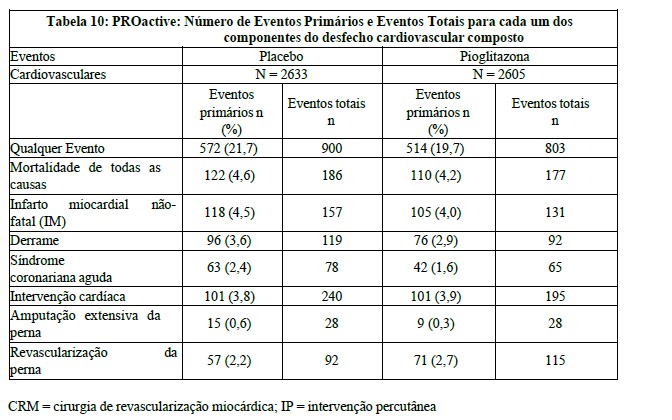 Um total de 514 (19,7%) dos pacientes tratados com pioglitazona e 572 (21,7%) dos pacientes tratados com placebo apresentaram pelo menos um evento do desfecho primário composto (hazard ratio 0,90; Intervalo de confiança 95%: 0,80, 1,02, p = 0,10). Embora não haja diferença estatisticamente significativa entre a pioglitazona e o placebo para a incidência de um primeiro evento dentro deste composto em 3 anos, não houve aumento na mortalidade nem no número total de eventos macrovasculares com pioglitazona (ver Tabela 10 abaixo). A porcentagem de pacientes que tiveram um caso de insuficiência cardíaca grave foi maior entre os pacientes tratados com pioglitazona (5,7%, n = 149) do que para os pacientes tratados com placebo (4,1%, n = 108). A incidência de morte na sequência de um relato de insuficiência cardíaca grave foi de 1,5% (n = 40) em pacientes tratados com pioglitazona e 1,4% (n = 37) em pacientes tratados com placebo. Em pacientes tratados com um regime contendo insulina no início do estudo, a incidência de insuficiência cardíaca grave foi de 6,3% (n = 54/864) com pioglitazona e 5,2% (n= 47/896) com placebo. Para aqueles tratados com um regime contendo sulfonilureia no início do estudo, a incidência de insuficiência cardíaca grave foi de 5,8% (n = 94 /1,624) com pioglitazona e 4,4% (n = 71 /1,626) com placebo.