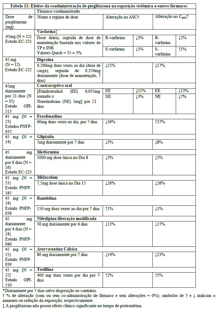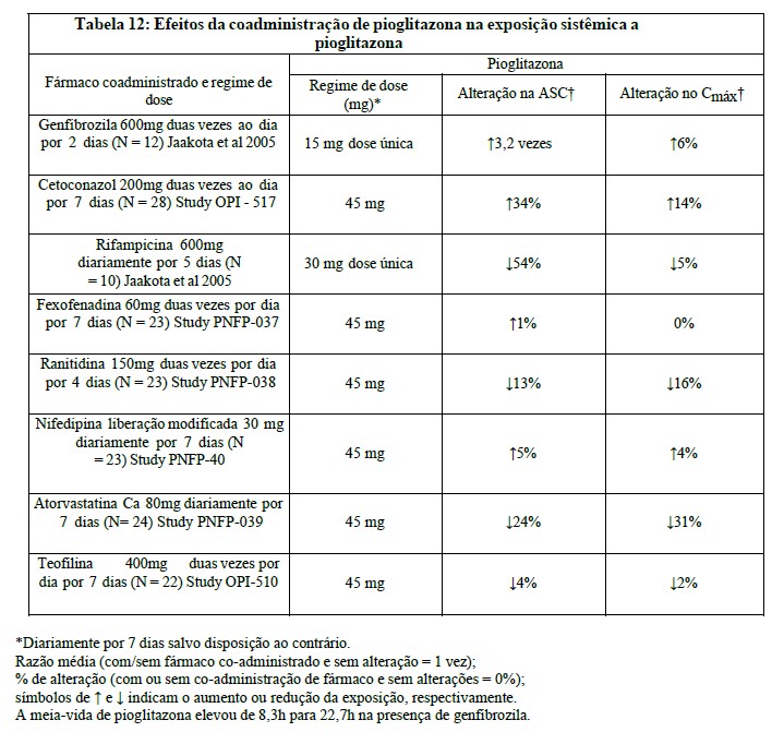 Estudos de interação mostraram que a pioglitazona não possui efeito relevante na farmacocinética nem na farmacodinâmica de digoxina, varfarina, femprocumona e metformina. Foi relatado que a administração concomitante de pioglitazona com genfibrozila (um inibidor de CYP2C8) ou com rifampicina (um indutor de CYP2C8) aumenta ou reduz, respectivamente, a concentração plasmática de pioglitazona