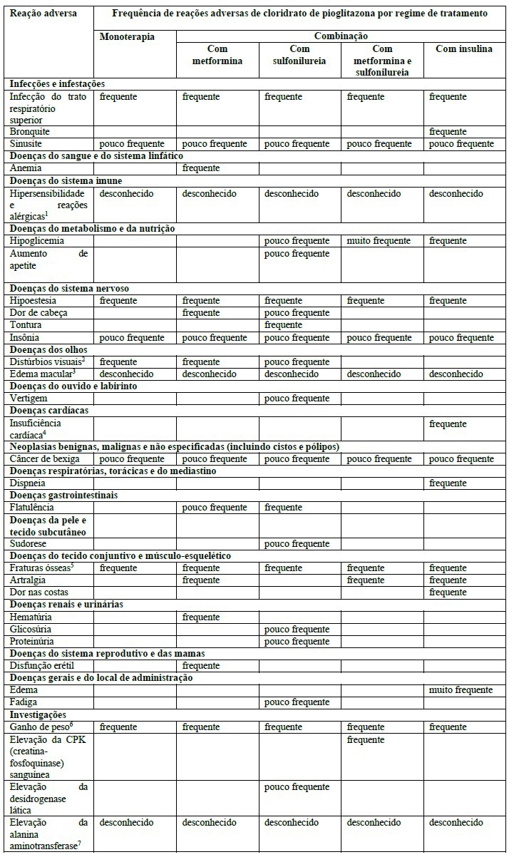 Hematologia: em estudos clínicos controlados e comparativos sobre o tratamento com pioglitazona, houve uma pequena redução na hemoglobina média (redução relativa de 4%) e hematócrito (redução relativa de 4,1%), consistentes com hemodiluição. Alterações semelhantes foram vistas com metformina (reduções relativas de hemoglobina 3 - 4% e hematócrito 3,6 - 4,1%) e em uma extensão menor com sulfonilureia (reduções relativas de hemoglobina 1 - 2% e hematócrito 1 - 3,2%).