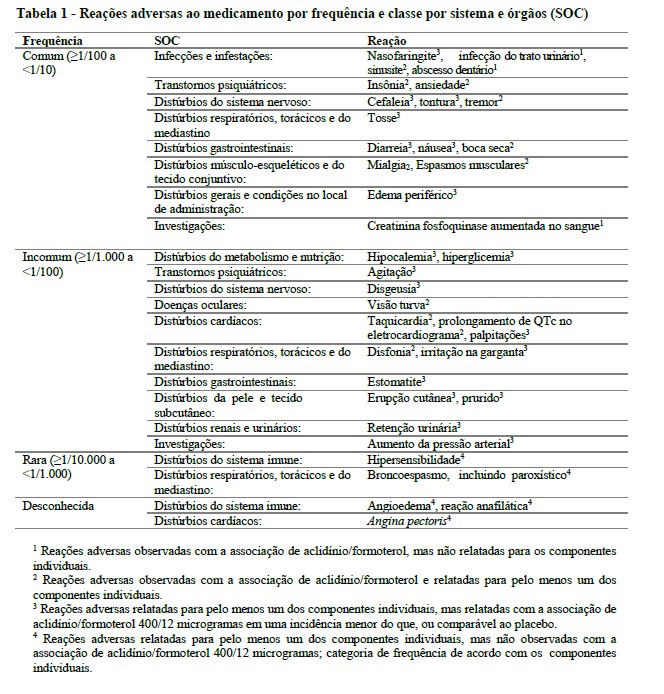 As Reações Adversas ao Medicamento inclusas na Tabela 1 são baseadas na experiência com a associação de aclidínio/formoterol e os monocomponentes individuais.