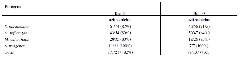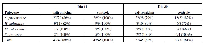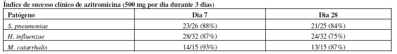 Protocolo 02: em um estudo clínico e microbiológico não comparativo realizado nos Estados Unidos, onde foram encontradas taxas significativas de produção de organismos beta-lactamase (35%), 131 pacientes foram avaliados para eficácia clínica. Na visita do dia 11, a taxa de sucesso clínico combinado (ou seja, cura e melhoria) foi de 84% para azitromicina. Para os 122 pacientes que foram avaliados no dia 30 da visita, a taxa de sucesso clínico foi de 70% para azitromicina. As determinações microbiológicas foram feitas na visita pré-tratamento. A microbiologia não foi reavaliada em visitas posteriores. As seguintes taxas de sucesso clínico foram obtidas a partir do grupo avaliado: