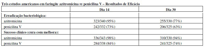 Em três estudos controlados, duplo-cegos, conduzidos nos Estados Unidos, a azitromicina (12 mg/kg, 1 vez ao dia, por 5 dias) foi comparada à penicilina V (250 mg, 3 vezes ao dia, por 10 dias) no tratamento de faringite associada ao Grupo A streptococci beta-hemolítico (GABHS - estreptococos beta-hemolíticos do grupo A - ou S. pyogenes). A azitromicina foi estatisticamente superior clinicamente e microbiologicamente à penicilina nos parâmetros clínico e microbiológico no Dia 14 e Dia 30, com o seguinte sucesso clínico (por ex. Cura e melhora) e taxas de eficácia bacteriológica (para a combinação de pacientes avaliada documentada na GABHS):