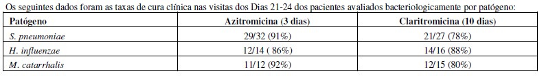Em um estudo controlado, randomizado, duplo-cego de exacerbação bacteriana aguda de bronquite crônica, azitromicina (500 mg, 1 vez ao dia, por 3 dias) foi comparada à claritromicina (500 mg, 2 vezes ao dia, por 10 dias). O principal endpoint deste estudo foi a taxa de cura clínica do Dia 21-24. Entre os 304 pacientes analisados na Intenção de Tratar Modificada (In The Modified Intent To Treat Analysis) nas visitas do Dia 21-24, a taxa de cura clínica para 3 dias de azitromicina foi 85% (125/147) comparado a 82% (129/157) para 10 dias de claritromicina.
