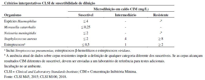 Metodologia para a determinação da suscetibilidade in vitro de bactérias à azitromicina: os testes de suscetibilidade devem ser realizados utilizando métodos laboratoriais padronizados, tais como aqueles descritos pelo Clinical and Laboratory Standards Institute (CLSI). Estes incluem os métodos de diluição (determinação CIM) e métodos de suscetibilidade de disco. Ambos, o CLSI e o Comitê Europeu para Testes de Suscetibilidade Antimicrobiana (EUCAST) fornecem critérios interpretativos para estes métodos. Com base numa série de estudos, recomenda-se que a atividade in vitro da azitromicina seja testada no ar ambiente, para garantir um pH fisiológico do meio de crescimento. As tensões elevadas de CO2, muitas vezes usadas para estreptococos e anaeróbios, e, ocasionalmente, para outras espécies, resultam em uma redução do pH do meio. Isto tem um efeito adverso maior sobre a potência aparente da azitromicina do que sobre a de outros macrolídeos. Os valores limite de suscetibilidade CLSI, com base na microdiluição em caldo ou testes de diluição em Agar, com incubação no ar ambiente, se encontram na tabela abaixo: