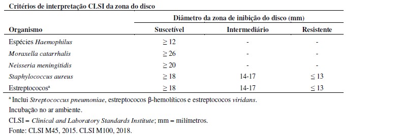 A suscetibilidade também pode ser determinada pelo método de difusão em disco, medindo os diâmetros da zona de inibição após incubação no ar ambiente. Os discos de suscetibilidade contêm 15 mg de azitromicina. Os critérios de interpretação para as zonas de inibição, estabelecidos pelo CLSI com base em sua correlação com as categorias de suscetibilidade MIC, estão listados na tabela abaixo:
