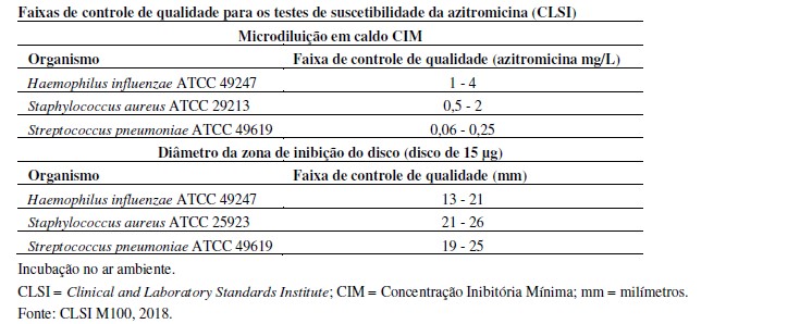 A validade de ambos os métodos de teste de diluição e difusão de disco deve ser verificada usando cepas de controle de qualidade (CQ), como indicado pelo CLSI. Os limites aceitáveis para o teste de azitromicina contra esses organismos estão listados na tabela abaixo: