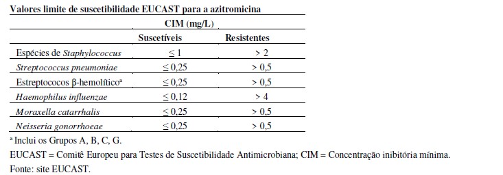 O Comitê Europeu em Testes de Suscetibilidade Antimicrobiana (EUCAST) também tem valores limite de suscetibilidade estabelecidos para azitromicina, com base na determinação do CIM. Os critérios de suscetibilidade EUCAST estão listados na tabela abaixo: