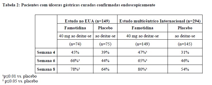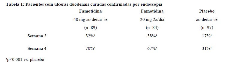 Revisões de estudos clínicos, multicêntricos e prospectivos, com 2.600 pacientes e analisando diversas dosagens de famotidina (20 e 40 mg b.i.d. e 40 mg/dia) em pacientes com úlcera duodenal, mostraram aumento progressivo dos índices de cicatrização de úlcerasao longo do período de utilização, obtendo 46% em duas semanas, 77% em quatro semanas e 91% após oito semanas de tratamento.