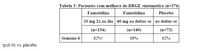 A famotidina administrada por via oral foi comparada ao placebo em um estudo norte-americano que recrutou pacientes com sintomas de DRGE e sem evidência endoscópica de erosão ou ulceração esofágica. Conforme mostrado na tabela a seguir, os pacientes tratados com famotidina 20 mg duas vezes ao dia tiveram maior melhora na DRGE sintomática do que os pacientes tratados com 40 mg ao deitar ou placebo.