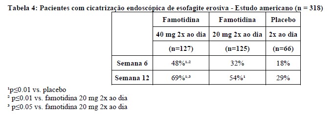 A cicatrização da erosão verificada endoscopicamente e a melhora sintomática foram estudadas em um estudo duplo-cego americano e internacional. A cicatrização foi definida como a resolução completa de todas as erosões visíveis com endoscopia. O estudo norte-americano comparando famotidina 40 mg duas vezes ao dia com placebo e famotidina administrada por via oral 20 mg duas vezes ao dia mostrou uma porcentagem significativamente maior de cura da esofagite erosiva para famotidina 40 mg duas vezes ao dia nas semanas 6 e 12 (tabela 4).