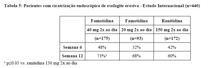 No estudo internacional, quando a famotidina administrada via oral 40 mg duas vezes ao dia foi comparada com a ranitidina administrada via oral 150 mg duas vezes ao dia, uma porcentagem estatisticamente significativamente maior de cura da esofagite erosiva foi observada com famotidina 40 mg duas vezes ao dia na semana 12 (tabela 5). Não houve, no entanto, diferença significativa no alívio dos sintomas entre os grupos de tratamento.