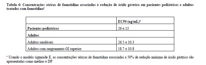 A farmacodinâmica da famotidina, avaliada pelo pH gástrico, foi avaliada em 5 pacientes pediátricos de 2 a 13 anos de idade usando o modelo sigmoide E. Esses dados sugerem que a relação entre a concentração sérica de famotidina e a supressão do ácido gástrico é semelhante à observada em adultos (ver tabela 6).