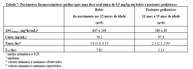 A biodisponibilidade média em 8 pacientes pediátricos foi de 50% em comparação com valores de adultos de 42% a 49%. Parâmetros farmacocinéticos em pediatria de 11 anos a 15 anos são comparados a bebês desde o nascimento até 12 meses na Tabela 7.