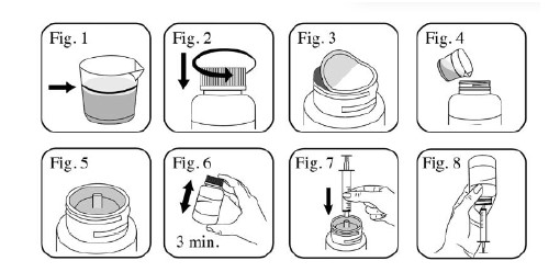 1. Antes da administração, reconstitua Famox suspensão adicionando água filtrada, em temperatura ambiente, no frasco. Para tanto, inicialmente, adicione água filtrada até a marca indicada no copo dosador disponível na embalagem do produto (Fig. 1).