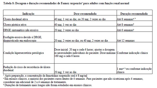 A dose recomendada de Famox é de um comprimido de 40 mg/dia, ao deitar-se. A duração do tratamento é de 4 a 8 semanas, podendo ser abreviada se a endoscopia revelar que a úlcera foi curada.