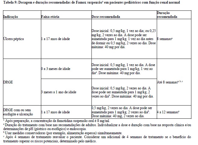 Em geral, utilizar a menor dose eficaz de famotidina para suspensão oral para um paciente idoso e monitorar a função renal.