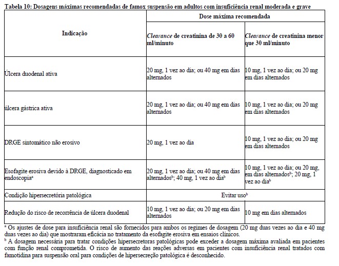Em pacientes adultos com insuficiência renal grave (clearance de creatinina inferior a 30 mL/minuto), a exposição sistêmica (ASC) da famotidina aumentou pelo menos 5 vezes. Em pacientes adultos com insuficiência renal moderada (clearance de creatinina entre 30 a 60 mL/minuto), a ASC da famotidina aumentou pelo menos 2 vezes (Leia o item "8. Posologia e modo de usar").