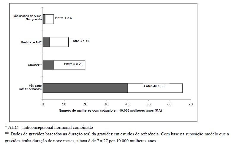 • A figura a seguir mostra o risco de desenvolvimento de tromboembolia venosa para mulheres não grávidas e que não usam AHCs, para mulheres que usam AHCs, para mulheres grávidas e para mulheres em período pós-parto. Para colocar em perspectiva o risco de desenvolvimento de tromboembolia venosa: se 10.000 mulheres que não estão grávidas e não usam AHCs são acompanhadas por um ano, entre 1 e 5 delas irão desenvolver tromboembolia venosa.