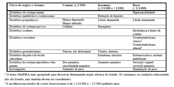 Neste item da bula, o termo anticoncepcional hormonal combinado (AHC) é empregado quando existem dados para anticoncepcionais orais e não orais. O termo anticoncepcional hormonal combinado oral (AHCO) é empregado quando existem dados apenas para anticoncepcionais orais.
