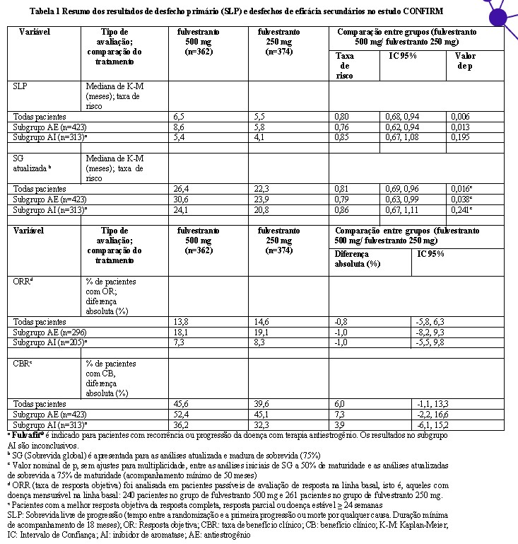 Um estudo clínico de fase III (Estudo D6997C00002 - CONFIRM) foi finalizado, com 736 mulheres na pós-menopausa com câncer de mama avançado que tiveram recorrência da doença ou após terapia endócrina adjuvante ou progrediu após terapia endócrina para doença avançada (Di Leo, A et al. Cancer Res 2009;69(24 Suppl):Abs 25). O estudo incluiu 423 pacientes, que apresentaram recorrência ou progressão da doença durante terapia antiestrogênio (subgrupo AE) e 313 pacientes com recorrência ou progressão durante terapia com inibidor de aromatase (subgrupo AI). Este ensaio comparou a eficácia e segurança de fulvestranto 500 mg (n=362) com fulvestranto 250 mg (n=374). A sobrevida livre de progressão (SLP) foi o desfecho primário. Os desfechos secundários de eficácia incluíram: taxa de resposta objetiva (ORR), taxa de benefício clínico (CBR) e sobrevida global (SG). A sobrevida livre de progressão para fulvestranto 500 mg foi significativamente mais longa que para fulvestranto 250 mg (mediana de 6,5 meses para fulvestranto 500 mg e 5,5 meses para fulvestranto 250 mg; HR=0,80; IC 95%: 0,68 a 0,94; p=0,006).