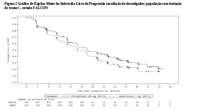 Observou-se uma melhora estatisticamente significante na SLP para o braço fulvestranto em relação ao braço anastrozol [HR=0,797 (IC 95%: 0,637-0,999; 2-sided p=0,0486). A SLP mediana foi de 16,6 meses (IC 95%: 13,83-20,99) no braço fulvestranto e 13,8 meses (IC 95%: 11,99-16,59) no braço anastrozol. Resultados consistentes foram observados na maioria dos subgrupos de pacientes pré-especificados. Para o subgrupo de pacientes com doença limitada a metástase não visceral (n=208), a HR foi de 0,592 (IC 95%: 0,419-0,837) para o braço fulvestranto comparado ao braço anastrozol. Para o subgrupo de pacientes com metástase visceral (n=254), a HR foi de 0,993 (IC 95%: 0,740-1,331) para o braço fulvestranto comparado ao braço anastrozol.