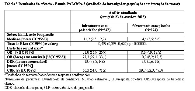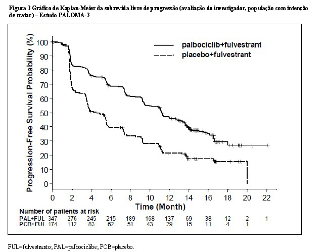 PALOMA-3 foi um estudo randomizado, duplo-cego, de grupo paralelos e multicêntrico de fulvestranto 500 mg com palbociclibe 125 mg versus fulvestranto 500 mg com placebo, conduzido em mulheres portadoras de câncer de mama positivo para o receptor hormonal (RH), negativo para o receptor do fator de crescimento epidérmico humano 2 (HER-2) e localmente avançado não passível de ressecção ou terapia de radiação com intenção curativa ou metastático, independentemente do estado menopausal, cuja doença progrediu após terapia endócrina prévia no cenário (neo) adjuvante ou metastático (Cristofanilli M. et al. Lancet 2016; 17 (4):425).