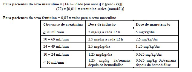 Terapia de indução: 5 mg/kg, administradas a cada 12 horas, por 14 - 21 dias, em pacientes com função renal normal.