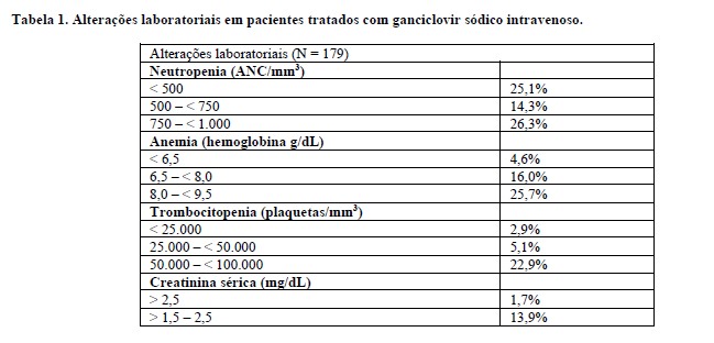 As alterações laboratoriais relatadas em três estudos clínicos em pacientes HIV positivo usando ganciclovir sódico intravenoso como tratamento de manutenção para a retinite por CMV estão listadas a seguir. Cento e setenta e nove pacientes foram elegíveis para a análise das alterações laboratoriais.