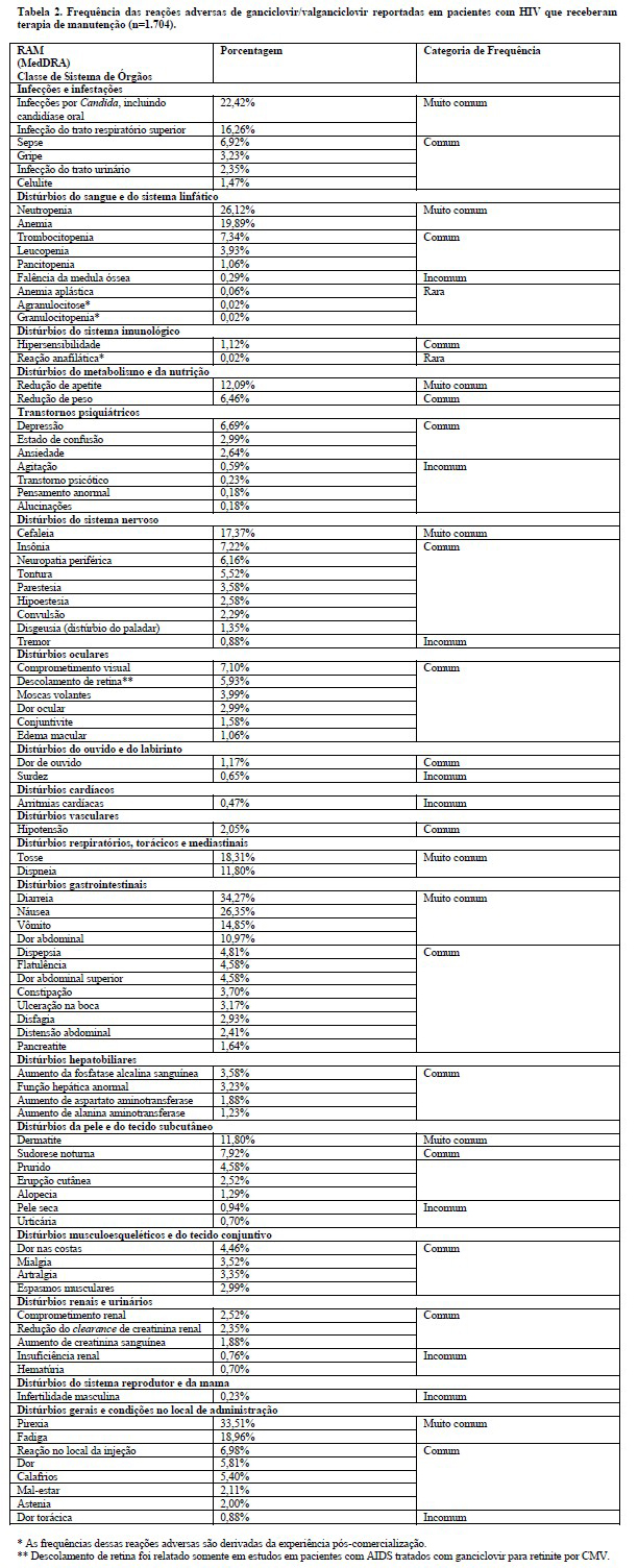 O valganciclovir é um pró-fármaco de ganciclovir e as reações adversas associadas ao valganciclovir podem ser esperadas com ganciclovir. Portanto, as reações adversas ao medicamento relatadas com ganciclovir EV ou oral (não disponível atualmente) ou com valganciclovir estão incluídas na tabela de reações adversas (ver "Tabela 2" a seguir).