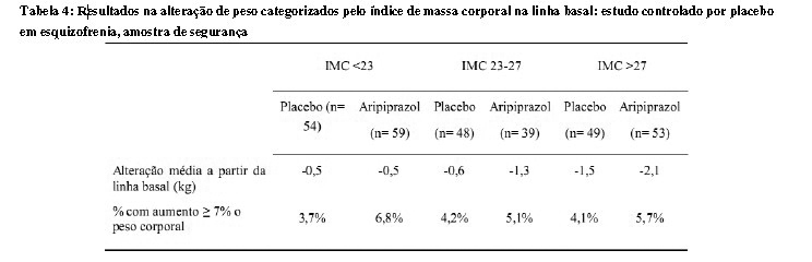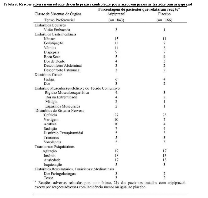 Em um estudo de quatro semanas (n= 414) para comparação de duas doses fixas de aripiprazol (15 mg/dia ou 30 mg/dia) ao placebo, as doses de aripiprazol foram superiores ao placebo na classificação total da PANSS, subescala positiva da PANSS e classificação de gravidade da CGI. Além disso, a dose de 15 mg foi superior ao placebo na subescala negativa da PANSS.