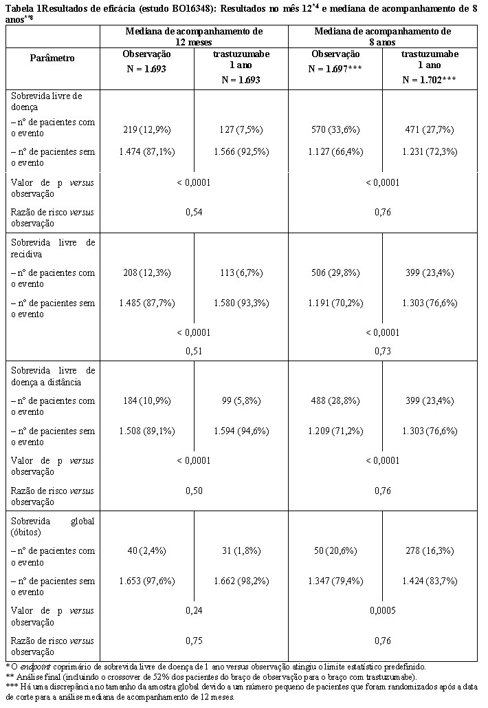 Os resultados de eficácia da análise interina cruzaram o limite estatístico predeterminado no protocolo para a comparação estatística de um ano de trastuzumabe versus observação. Após a mediana de acompanhamento de 12 meses, a razão de risco (HR) para a sobrevida livre de doença (SLD) foi de 0,54 (IC 95% 0,44, 0,67), que se traduz em um benefício absoluto, em termos de taxa de sobrevida livre de doença durante dois anos, de 7,6 pontos percentuais (85,8% versus 78,2%) favoráveis ao braço com trastuzumabe.